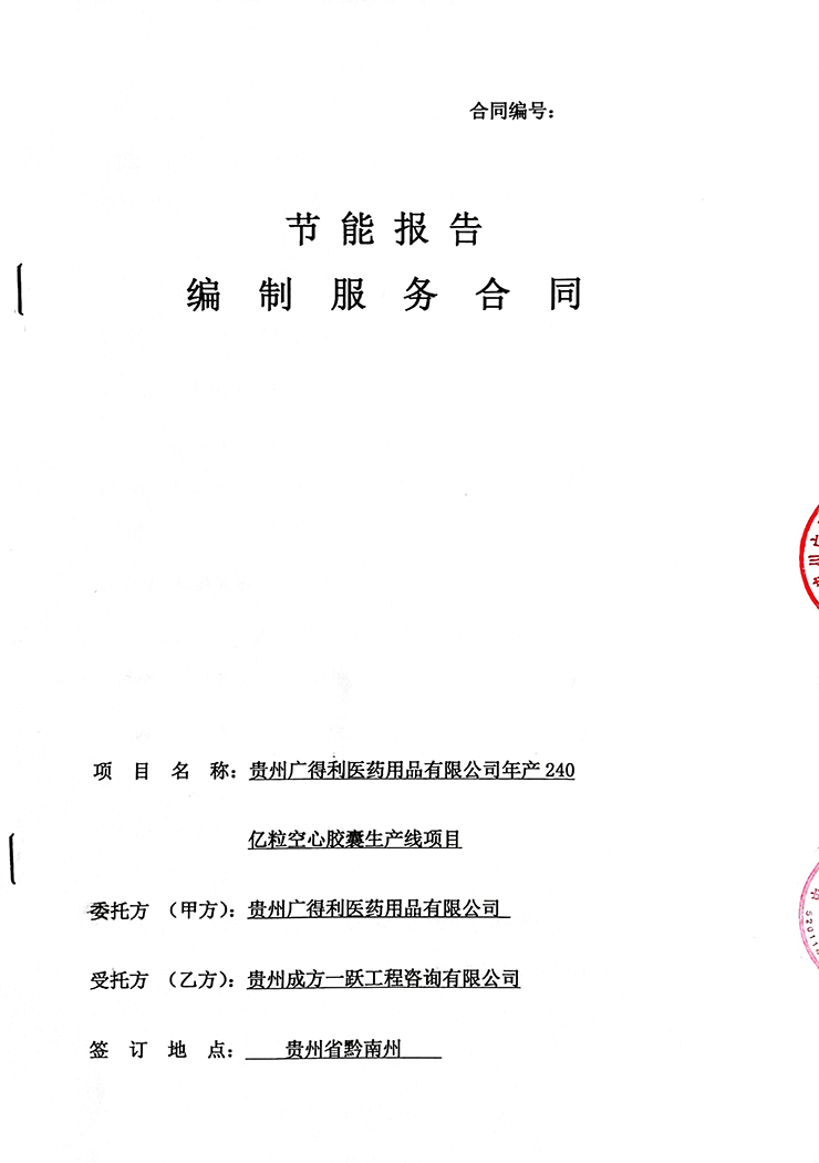 貴州廣得利醫(yī)藥用品有限公司年產(chǎn)240億??招哪z囊生產(chǎn)線項目節(jié)能報告編制服務(wù)合同